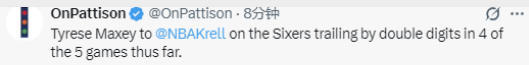 在谈到球队慢热的开局时,马克西表示:“本赛季至今的5场比赛中,我们有4场都曾落后对手两位数(分差),这其实反映了一种趋势正在形成。没人愿意轻易改变现状。关键在于循序渐进,我的意思是,无论是赢球还是为赢球付出的代价,我们打所有比赛时,总会遇到状态起伏:可能某一节表现糟糕,然后又能调整回来。