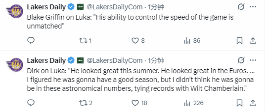 格里芬说道:“东契奇控比赛节奏的能力无人能及。”与他一起解说比赛的诺维茨基表示:“他今年夏天的状态非常好,在欧珠被上的表现也很出色,我当时就觉得他本赛季会有不错的发挥,但没想到他能打出如此惊人的数据,还能与张伯伦并肩,追平其纪录。”