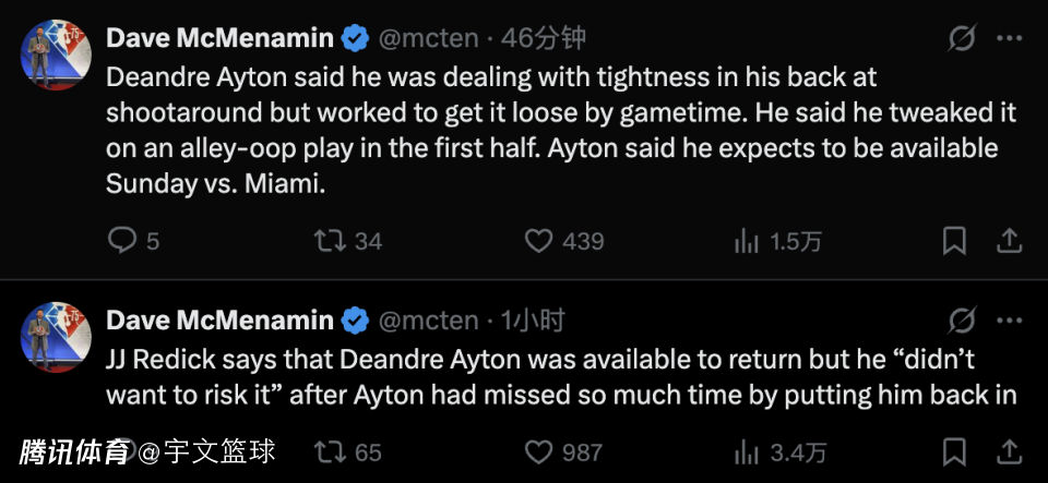 雷迪克表示艾顿遭遇背部痉挛,一直在更衣室里接受紧急处理。实际上艾顿可以在第四节比赛中登场,他当时已经具备上场条件,但是球队出于对他的保护,不愿意承担风险,最终还是选择不让其出战。