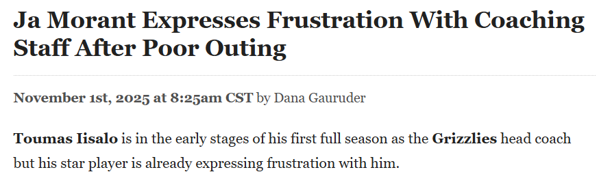 2025-11-01 23:10北京时间11月1日,伊萨洛作为灰熊队主教练的首个完整赛季才刚刚起步,他麾下的核心球员已对他表达出不满情绪。