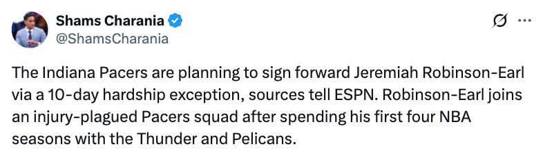 2025-11-02 01:00北京时间11月2日,据名记Shams报道,印第安纳步行者队计划用10天困难特例签下前锋罗宾逊-厄尔。