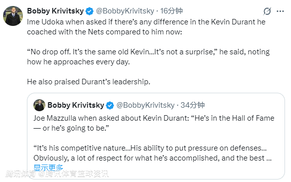 火箭绿军两大主帅谈杜兰特:他未来必会入选名人堂 状态较篮网时期没有下滑