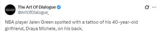 2025-11-02 09:10北京时间11月2日,外媒The Art Of Dialogue晒出了太阳队杰伦-格林展示背部新纹身的视频,在视频中可以看到,杰伦-格林将40岁女友德拉雅-米歇尔的肖像纹在了后背上。