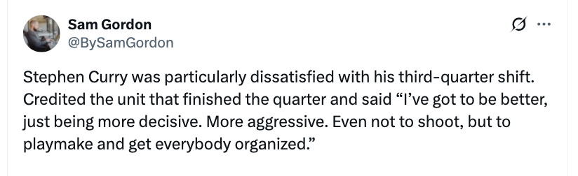 库里对自己第三节的表现尤为不满,不过他还是称赞了本节末段球队的阵容,并表示 “我必须做得更好,要更果断、更具侵略性。即便不投篮,也要去组织进攻,让每个人都进入节奏。”库里在第三节投篮3中0,没有得分入账。