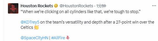 2025-11-02 11:10北京时间11月2日,NBA常规赛继续进行,火箭队128-101击败凯尔特人队。火箭队球员杜兰特此役出战30分钟,11投8中得到26分4篮板1助攻2抢断1盖帽。赛后,杜兰特在场边接受媒体采访,点评了比赛。