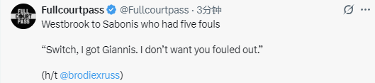 在第四节比赛最后时刻,小萨博尼斯已经身背5犯,在他罚球后退防时,威斯布鲁克朝小萨博尼斯喊道:“换防,我来对位扬尼斯,我可不想让你被罚出去。”