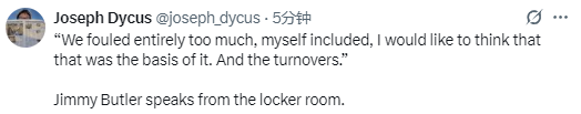 在谈到球队的防守表现时,巴特勒说道:“过去两场比赛,我们在防守端的沟通出现了一些问题。今晚一开始,大家的沟通还算顺畅,会主动交流想法。但说实话,过去几场比赛,我们的专注力确实没达到理想状态。但我们不会因此失去势头,我们只是还没打出自己最理想的篮球状态,要找回这种状态其实并不难。”
