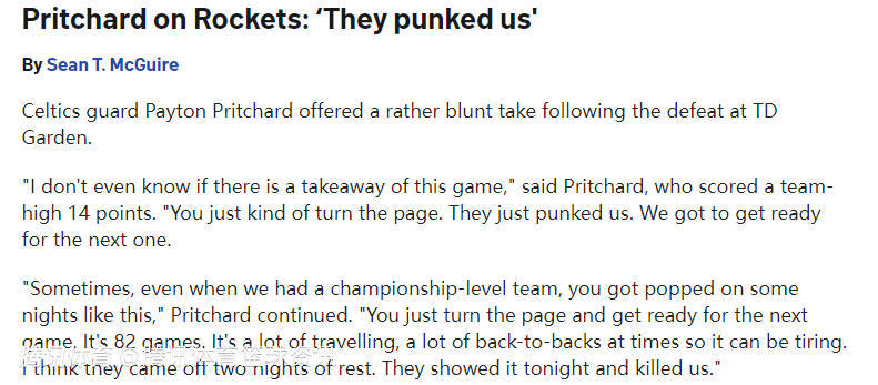 2025-11-02 11:50北京时间11月2日,NBA常规赛继续进行,火箭队128-101大胜凯尔特人队。普里查德此役10投5中得到14分4助攻,赛后他接受媒体采访,点评了比赛。