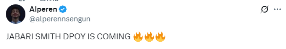 赛后,火箭球员申京更新社媒,称赞小贾巴里-史密斯在防守端的表现:“小贾巴里-史密斯的DPOY就要来了!”