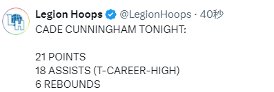 根据数据统计显示,本场比赛坎宁安凭借18次助攻追平个人此前最高的单场助攻记录。在2024年12月17日,活塞主场经加时苦战125-124险胜热火。当时坎宁安出战42分钟,17投7中得到了20分11篮板18助攻,助攻数创生涯新高。
