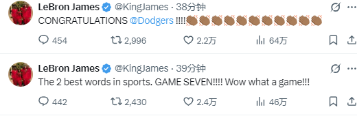 詹姆斯在个人推特上写道:“体育界最棒的词:抢七大战!哇,这场比赛太精彩了!恭喜道奇队。”