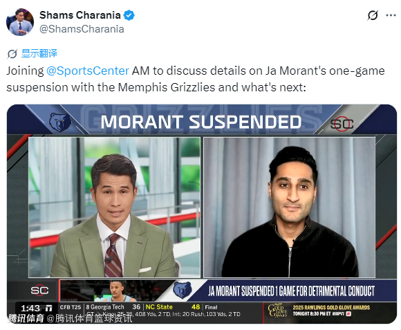 2025-11-02 22:10北京时间11月2日,名记Shams在直播节目中,谈及关于灰熊球星莫兰特因“做出对球队不利的行为”被球队处以禁赛一场处罚一事的后续进展。