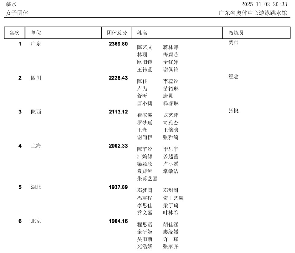 四川表现不俗:一号卢为跳出370.75;二号李蕊汐347.90列第四。
