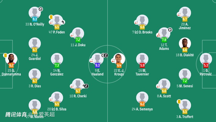 第33分钟,谢尔基再送助攻,哈兰德单刀双响,曼城2-1伯恩茅斯。