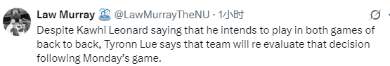 据快船队记Law Murray报道,尽管莱昂纳德本人愿意出战背靠背比赛,但泰伦-卢表示,球队将在明日对阵热火的比赛后,再对此做出评估。