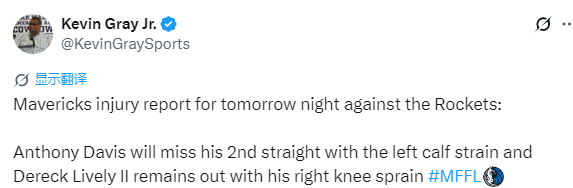 独行侠伤情:浓眉左小腿拉伤连续第二场缺席比赛 莱夫利右膝扭伤无法出战火箭
