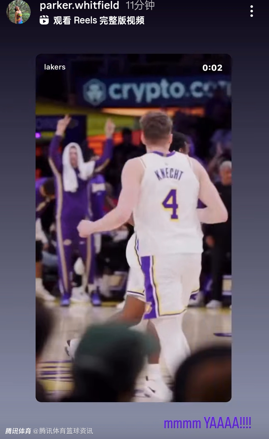 在布朗尼和里夫斯完成了这次配合后,场边的湖人球员均站起来为他庆祝,而他的父亲詹姆斯则是身着便装振臂欢呼,同样起身为儿子这个进球庆祝。另外,布朗尼的女友帕克也在社媒转载了布朗尼的这个进球。