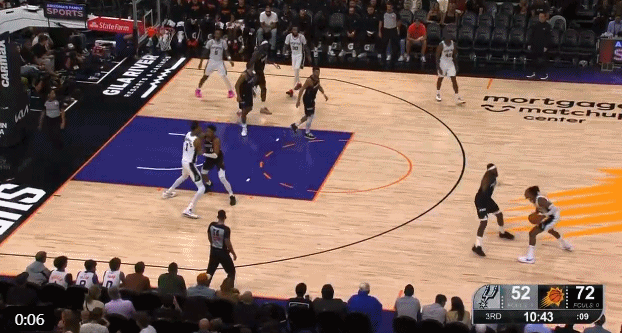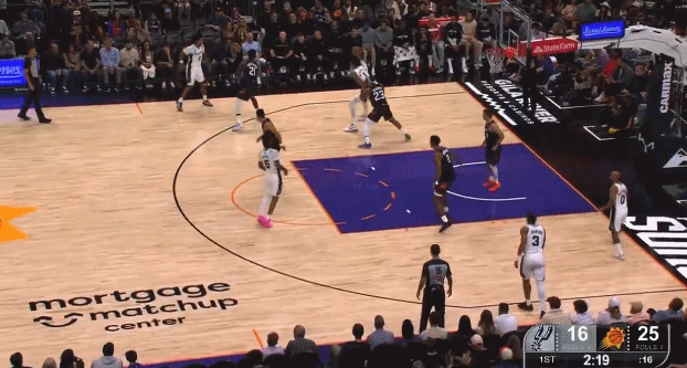 锋线球员卡住文班亚马下盘,不让他运球,一旦文班亚马强行运球,太阳及时上包夹,增加他的进攻难度,逼迫他高难度出手或失误。即便文班亚马把球传出,考验马刺射手群。今天马刺射手群三分球41投只有10中。