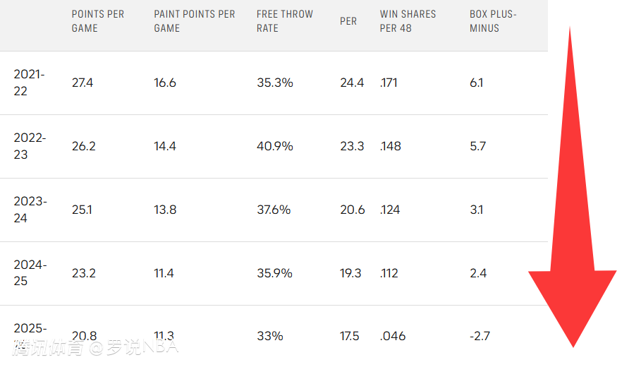莫兰特最近的表现并不像一个巨星。无论你是看得分数据还是高级指标,数据都表明,自2022年达到巅峰以来,莫兰特的表现一直在慢慢下降,场均得分从27.4分一路下滑至20.8分,连续4年下降。虽然莫兰特只有26岁,但这些数据不由让人觉得他已过巅峰,处于下降的通道中。