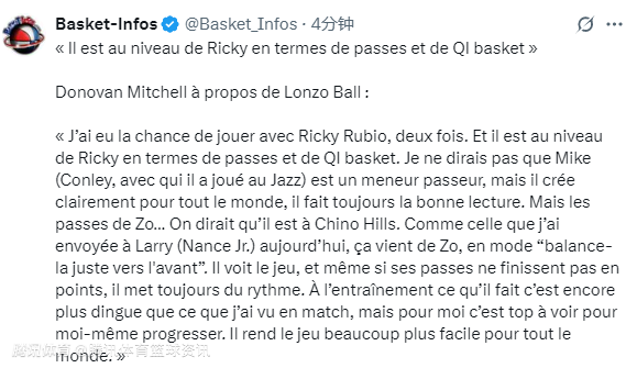 米切尔表示:“我曾有幸与卢比奥做过两次队友。在传球能力和篮球智商方面,朗佐-鲍尔已经达到了卢比奥的水准。”