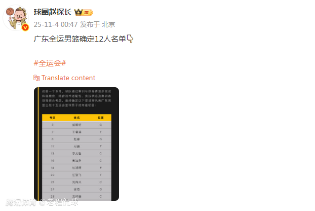 2025-11-04 07:00媒体人赵探长透露广东全运会男篮的12人名单已经确定,由赵睿、胡明轩领衔,12名球员都有国手或进入国家队集训的经历。