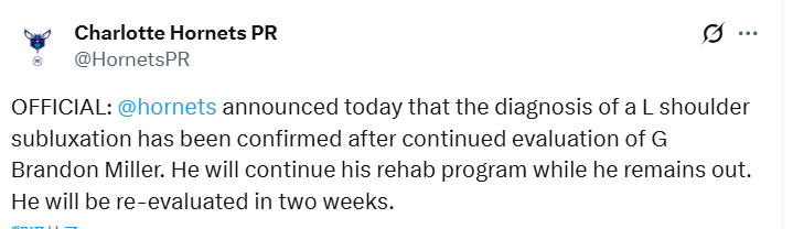 黄蜂官方:布兰登-米勒确诊为左肩半脱位 两周后将接受重新评估
