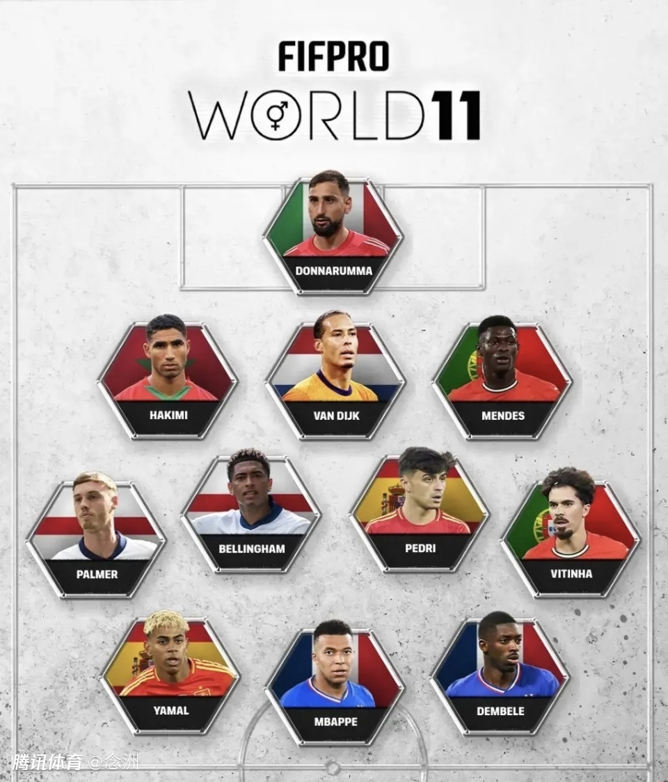 国际职业足球运动员联合会公布了年度最佳11人,登贝莱、姆巴佩、亚马尔领衔锋线,贝林厄姆入围,欧冠冠军巴黎圣日耳曼有5名球员入围。