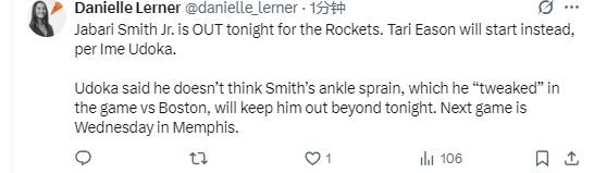 乌度卡在谈到小贾巴里-史密斯的伤病情况时表示:“他是在对阵凯尔特人队的比赛中轻微拉伤,预计本场比赛之后很快就能复出。”火箭队的下一场比赛,将是在北京时间本周四进行,对手是灰熊队。