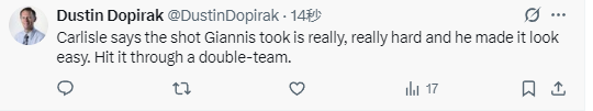 卡莱尔说道:“扬尼斯投进了一记难度极高的球,可他却让这记投篮看起来轻而易举,而且他还是在双人包夹的防守下投进的。所以说,这是一记绝妙的进球。比赛最终的结果令人失望,但球队展现出的拼劲是毋庸置疑的。”