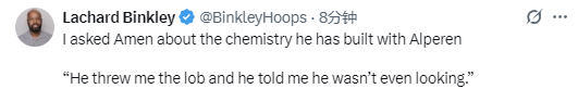 在谈到申京助攻自己空接暴扣的那次配合时,阿门-汤普森表示:“我感觉我们就是心有灵犀。你知道,他是我的好兄弟,所以我们很清楚彼此的位置,我知道他会出现在哪里,他也知道我会在什么地方,就是这样。他给我传了一个空接,而且他说自己当时甚至都没看我(的位置)。”