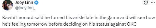 在谈到比赛的转折点时,莱昂纳德说道:“我觉得最大的转折点是,当时我脚踝扭了一下,导致他们得到了一个空位三分机会。那一刻对我来说,比赛局势就变了。他们就是靠那个空位三分得分的,要是没让他们投进那个球,我觉得我们能赢下比赛。”在谈到明天能否出战时,莱昂纳德说道:“到时候再看情况吧。”
