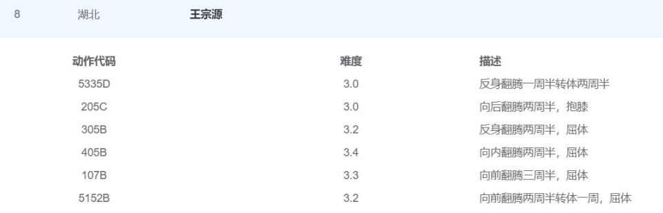 第2组动作王宗源为205C,这一跳他同样非常出色的完成比赛,单跳成绩72.00分排名第3位。郑九源5152B得到了76.80分的成绩。两组动作结束之后,郑九源反超王宗源0.30分。