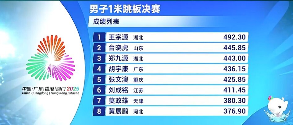 全运会男子1米板:王宗源断层领先摘金,世锦赛冠军郑九源获铜牌