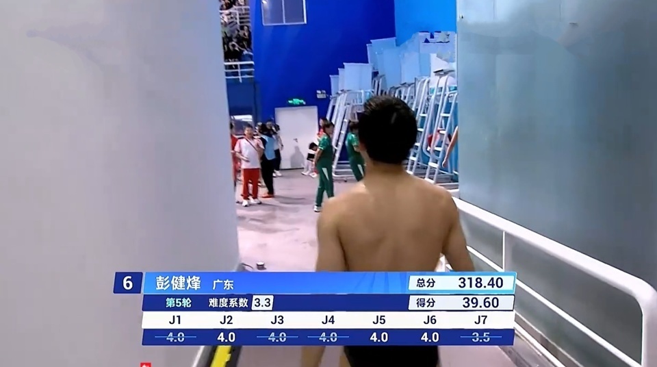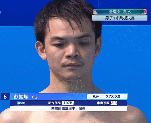 本来这只是一次随机事件,可没想到第五轮时,前四轮结束以278.80排在第六的广东老将彭健烽,也在完成107B(向前翻腾三周半屈体)时,出现了同样的走板问题!