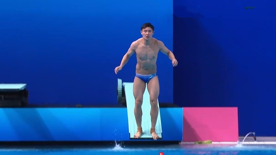 在板还没有完全弹起来的时候,整个人重心就已经向前压出去。面对这样的局面,经验丰富的彭健烽硬是将动作完全翻了过来,虽然入水没有打开,激起巨大水花,只拿到39.60,排名掉到第七。