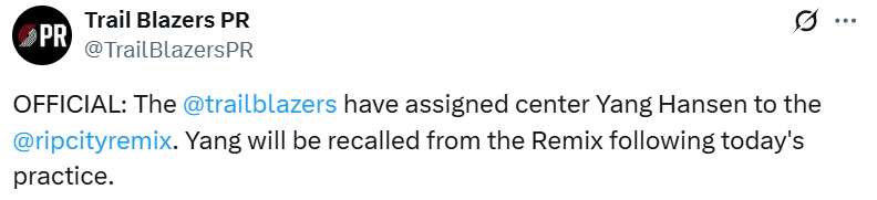2025-11-05 05:20北京时间11月5日,开拓者官方宣布:球队已将杨瀚森下放到G联赛(发展联盟)球队撕裂之城混音队。在今天训练结束后,杨瀚森将从混音队被召回。 换言之,杨瀚森的第二次下放是当天往返,而此前的首次下放,他在混音训练了两天。