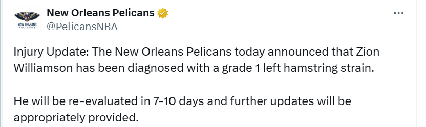 锡安又伤了!左腿筋一级拉伤至少缺席7-10天 美媒此前呼吁快交易他
