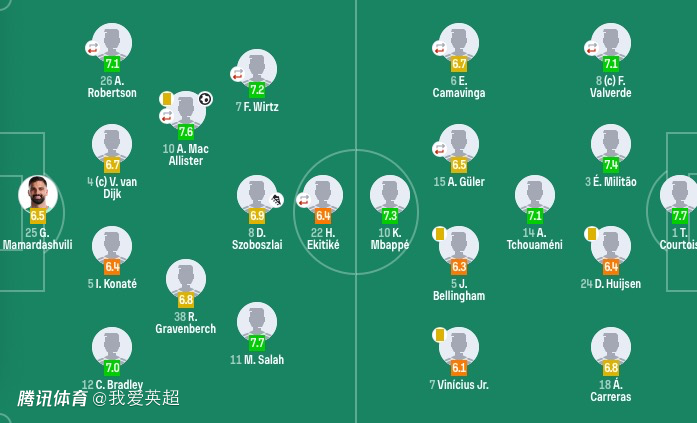 皇马首发:1-库尔图瓦、8-巴尔韦德、5-贝林厄姆、7-维尼修斯、10-姆巴佩