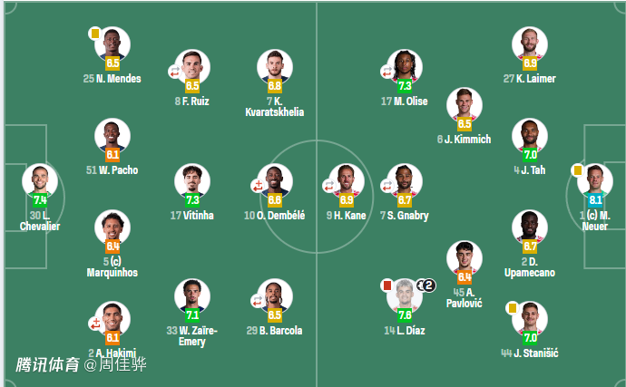 前锋:7-克瓦拉茨赫利亚、10-登贝莱(25’19-李刚仁)、29-巴尔科拉(66’9-贡萨洛·拉莫斯)