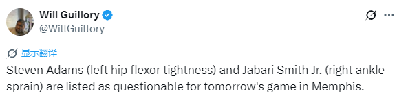 据悉,史蒂文-亚当斯(左髋屈肌紧张)和小贾巴里-史密斯(右脚踝扭伤)均被列为出战成疑。