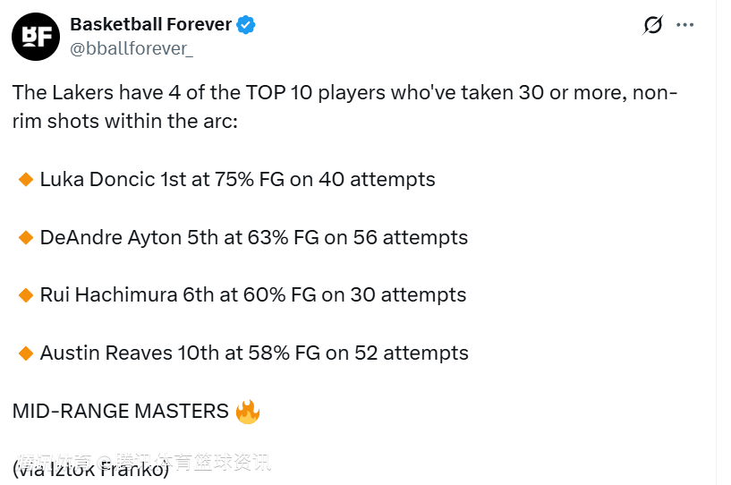 2025-11-05 08:20北京时间11月5日,根据Iztok Franko的统计显示,截至目前,在本赛季NBA所有至少30次中距离出手的球员中,湖人队有4人跻身命中率前十。