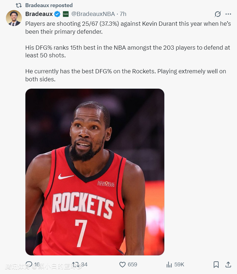 火箭记者Bradeaux写道:本赛季杜兰特成为主要防守人时,对手的命中率67中25(37.3%),在防守至少203位球员出手超50次的球员里,杜兰特的封盖率联盟第15位。杜兰特目前是火箭队防守效率最高的球员,他攻防两端都非常出色。