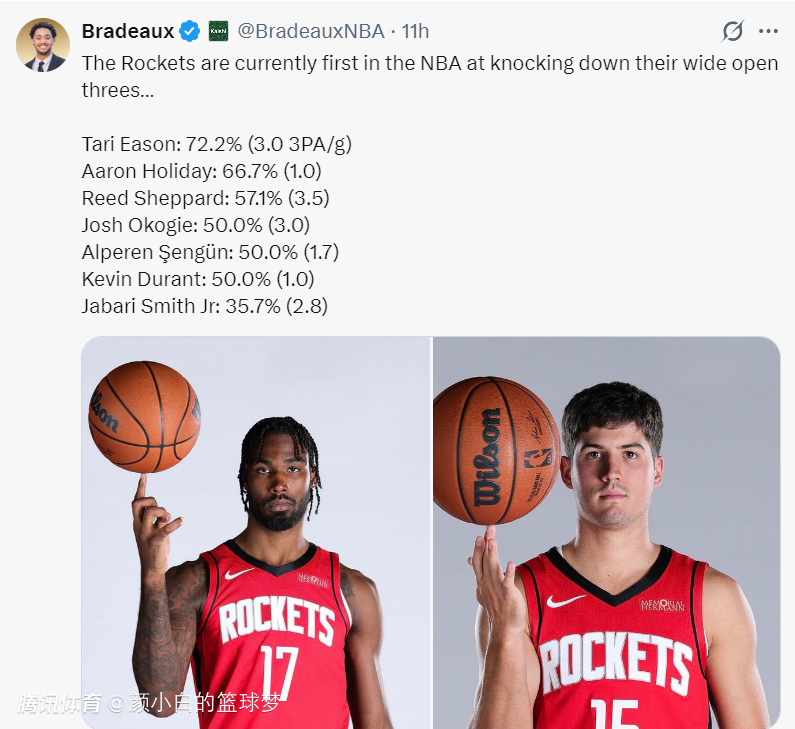 本赛季空位三分球命中率:伊森70%、霍勒迪66.7%、谢泼德57.1%、奥科吉50%、申京50%、杜兰特50%。小贾35.7%。