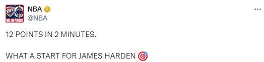 在暂停过后,哈登又得到5分,在首节比赛结束前3分8秒,在哈登三分远投命中后的下一个回合中,泰伦-卢提前让哈登下场休息。而NBA官方则连续发了两条推特,点赞哈登的表现。