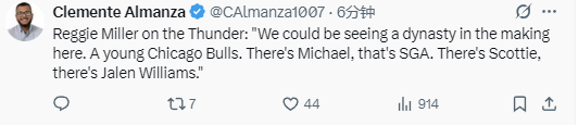 2025-11-05 14:40北京时间11月5日,前NBA球员雷吉-米勒谈到了雷霆队,他表示如今的这支雷霆队,很像是乔丹当年所带领的公牛队。