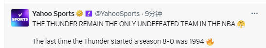 如果算上超音速队时期的历史,雷霆队则是追平了1994年超音速队所取得的开局8连胜纪录。