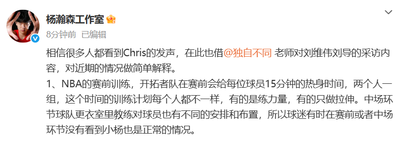 2025-11-05 17:40北京时间11月5日,杨瀚森工作室更新社媒,对近期的一些传言予以回应。具体如下——