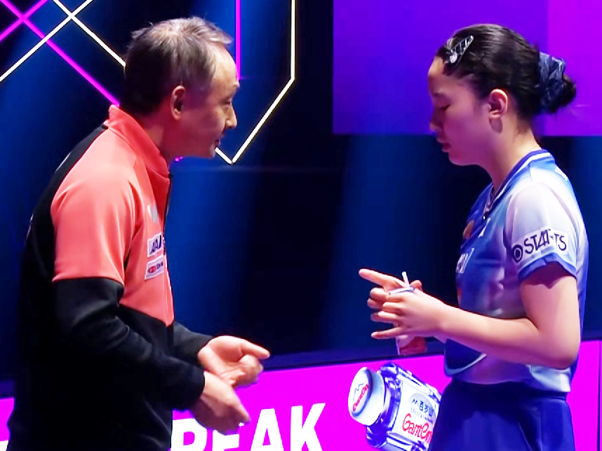 第二局张安开局领先没把握住,紧接着被追至7-7平后出现崩盘,张本美和抓住机会再得3分以10-7反超对手,但很快错失2个局点于是暂停下场与父亲张本宇沟通。重返赛场后,日本小将做出改变以逆旋转发球逼张安出现回球质量不高的情况,随后强势抢攻以11-9再下一城。