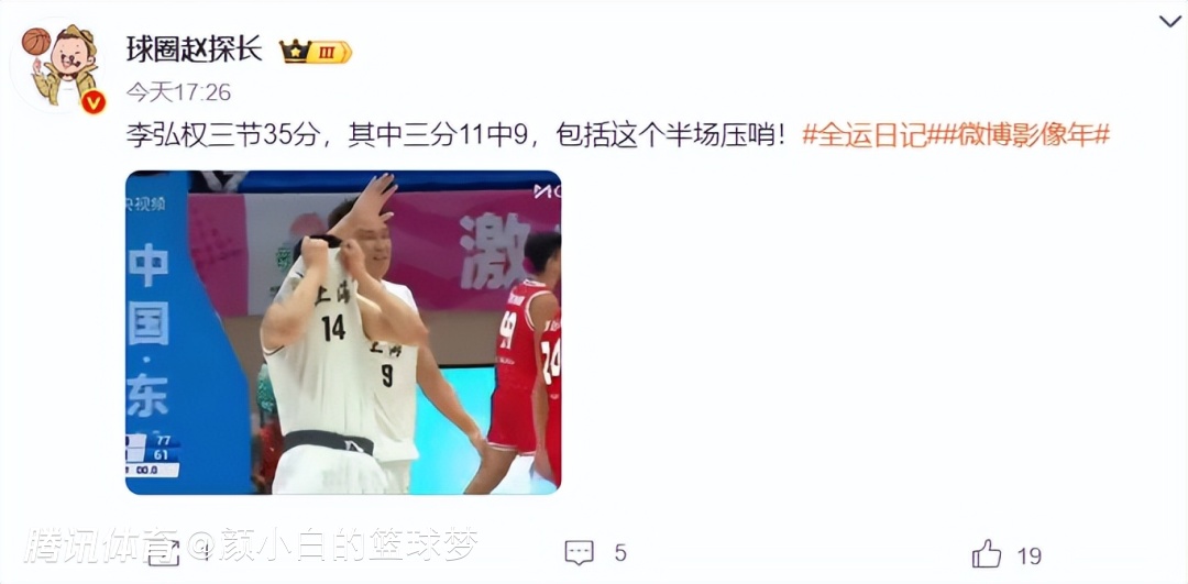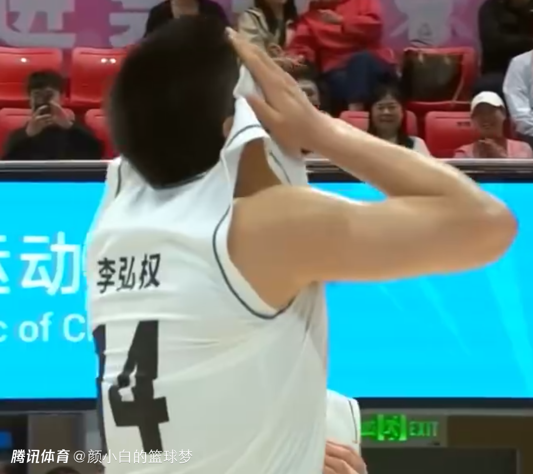 上半场结束前李弘权还有一个超远的压哨三分球,他本人都捂脸不敢相信。