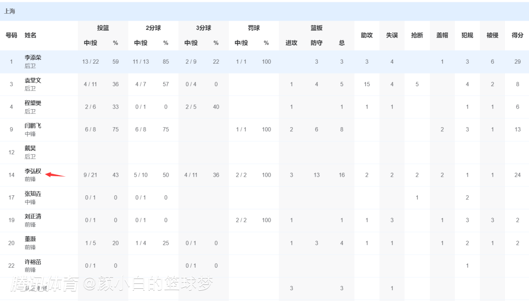 全场比赛李弘权17中14,三分12中10,拿到40分11篮板1盖帽1抢断1助攻,命中率82.3%,三分命中率83.3%,李弘权的个人表现实在是太过于炸裂。